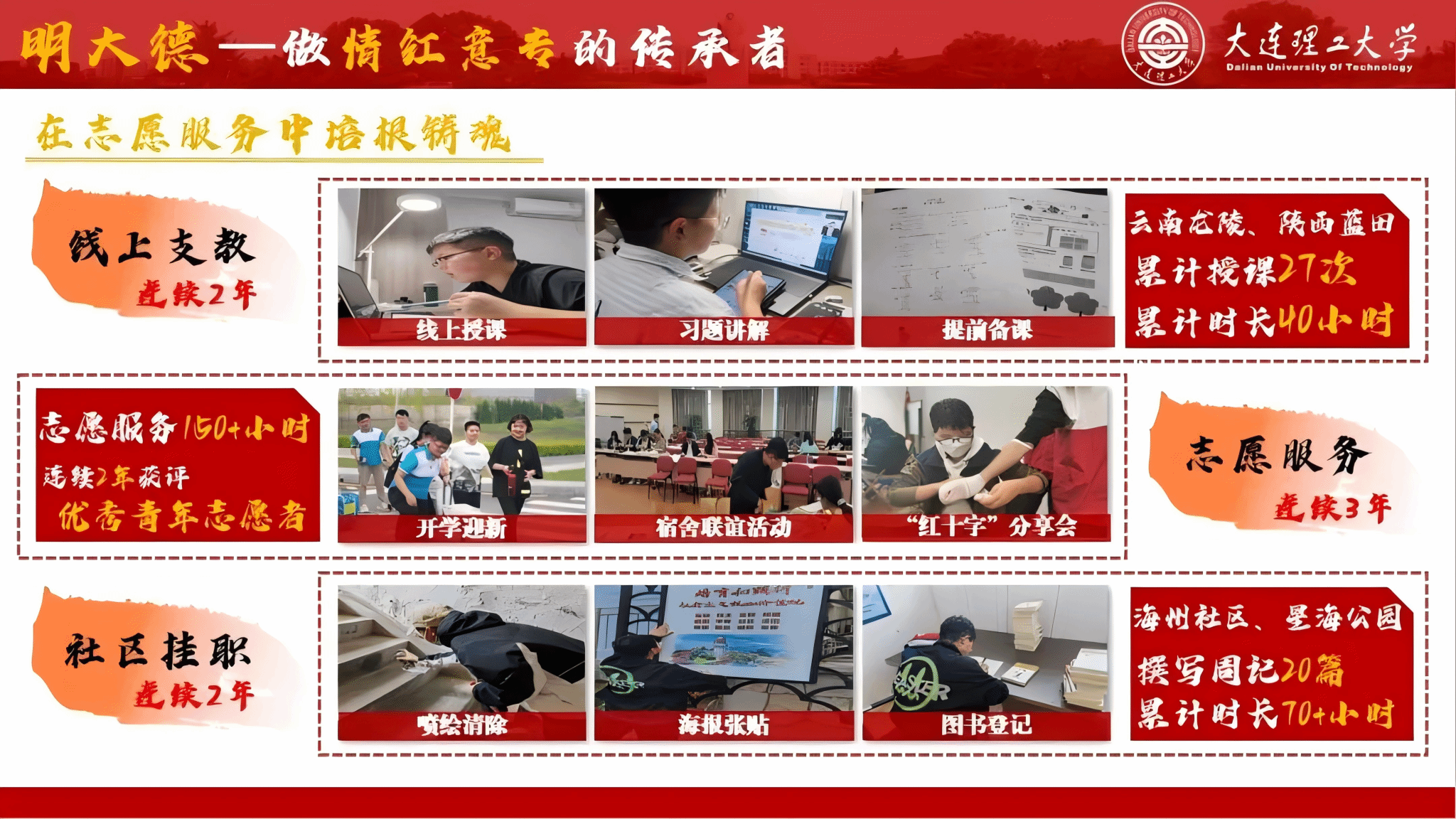 此外,武小青也积极参加志愿服务活动,她连续两年线上支教,累计授课27次,累计时长40小时;志愿服务150+小时、累计社区挂职时长70+小时;连续两年获评优秀青年志愿者,以奉献发光赋能。