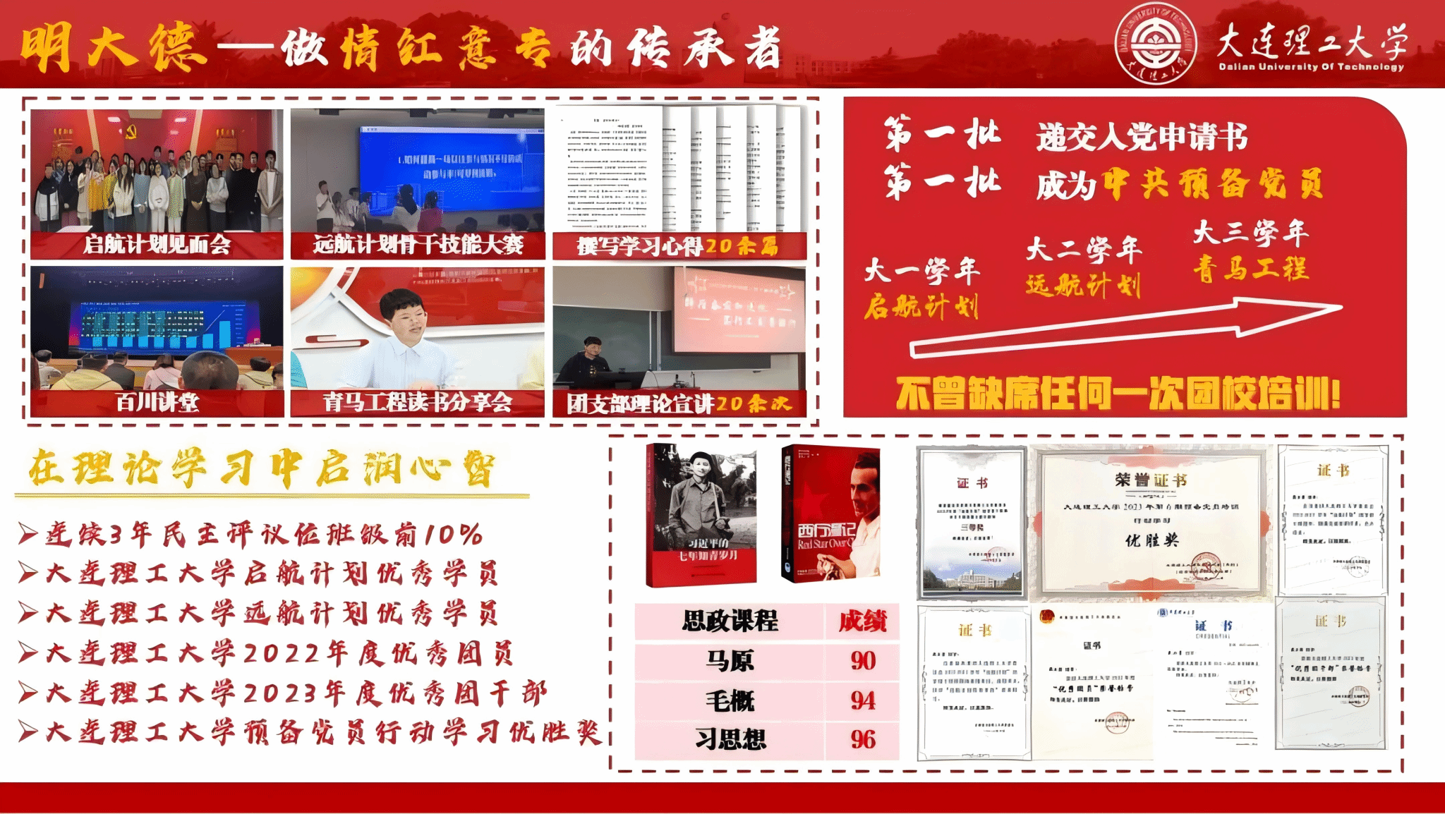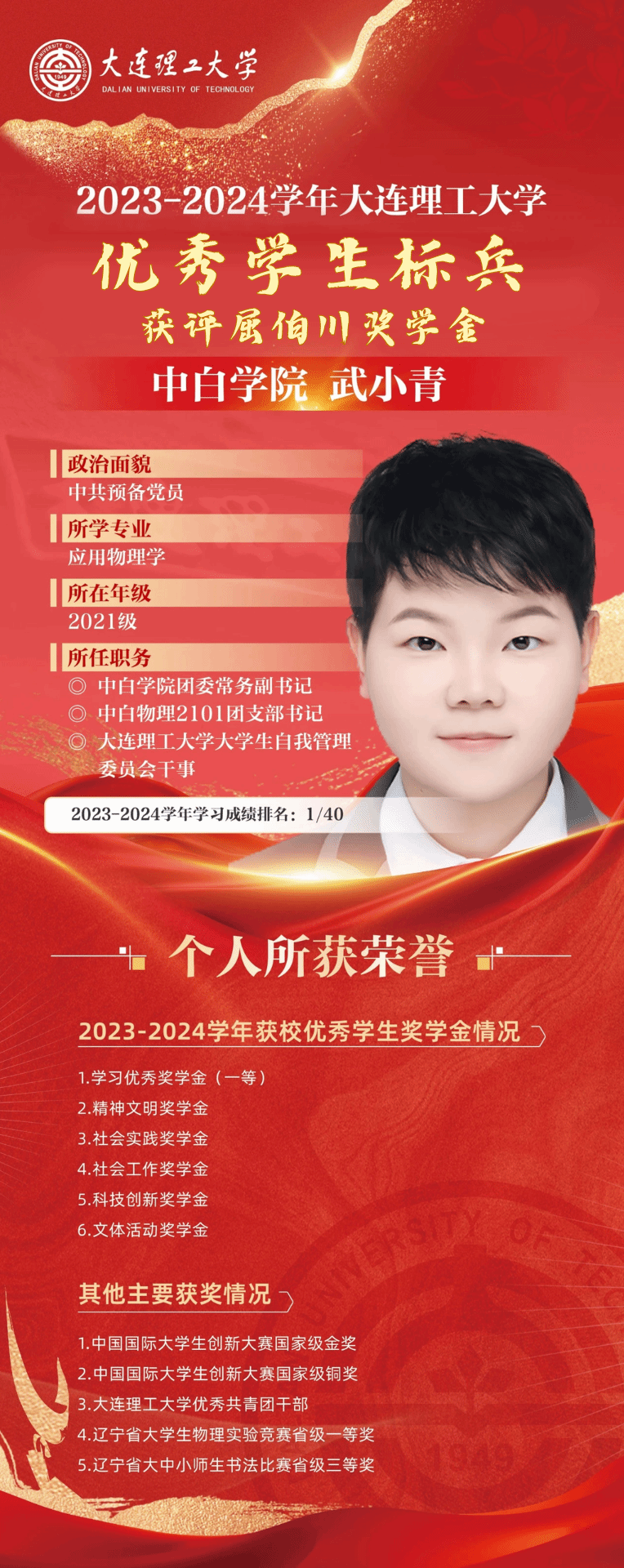 团委常务副书记、中白物2101团支部书记、大学生自我管理委员会干事等职务;获评2023-2024学年校优秀学生标兵、校优秀团干部、校优秀三好学生等荣誉。