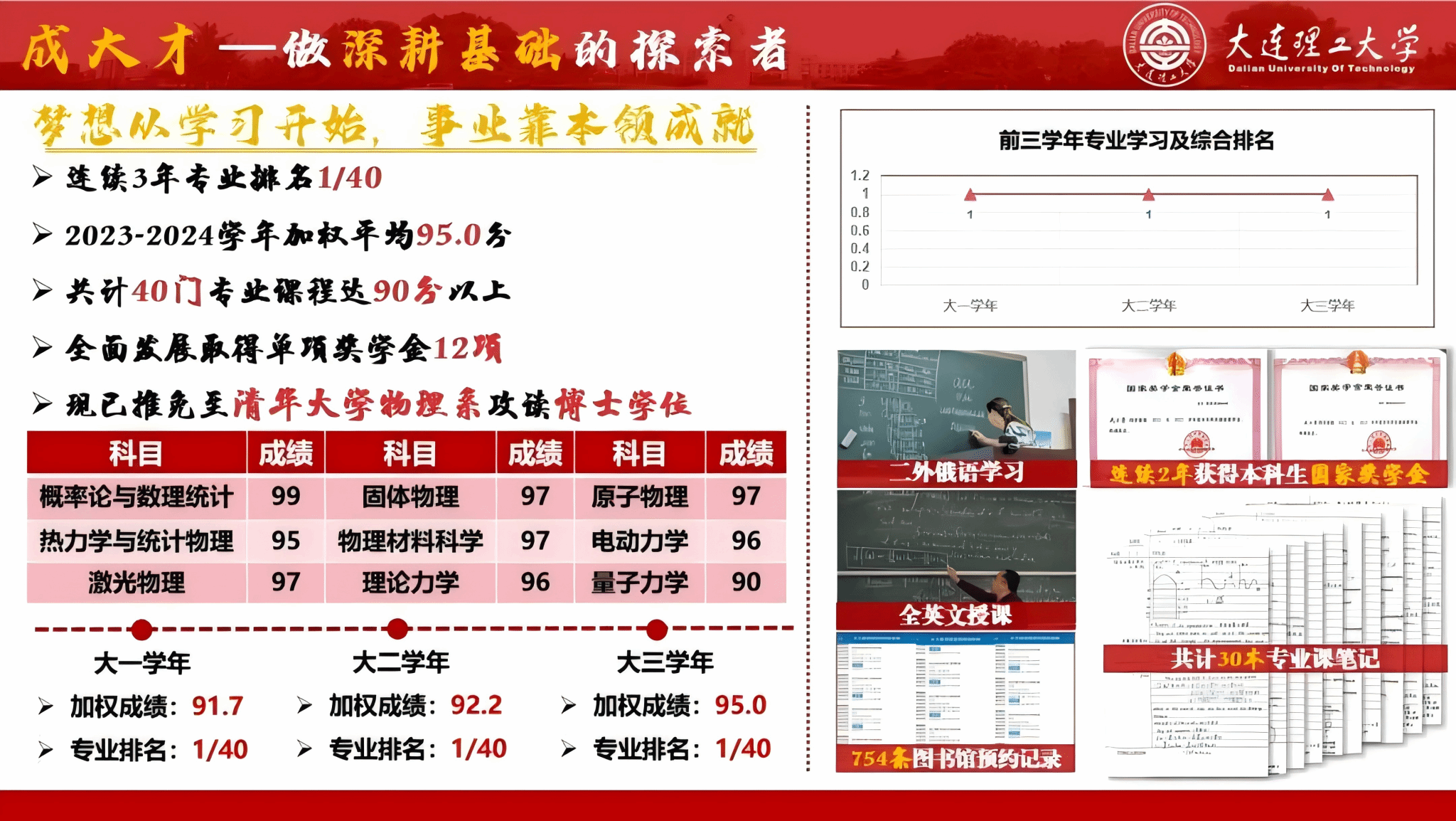 武小青始终坚信,作为一名学生,学习是她的第一要务。自入学起,武小青课上总是聚精会神、勤记笔记,课下则埋头钻研、按时复习,图书馆、自习室成了他每天的打卡地。2023-2024学年加权平均95.0分,共计40门专业课程达90分以上。