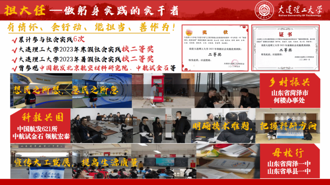 以理论悟新知,以实践求探索,武小青累计6次参加社会实践,她想民之所想,急民之所急,助力乡村振兴;她明确技术难题,把握科研方向,落实科教兴国;她宣传大工发展,提高生源质量,将大工之声带入母校。而这些所见所闻也不断激励她赓续奋斗。